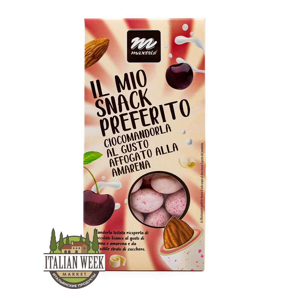 Обжаренный миндаль, покрытый белым шоколадом со вкусом сливок и вишни амарена, и тонким слоем сахара.