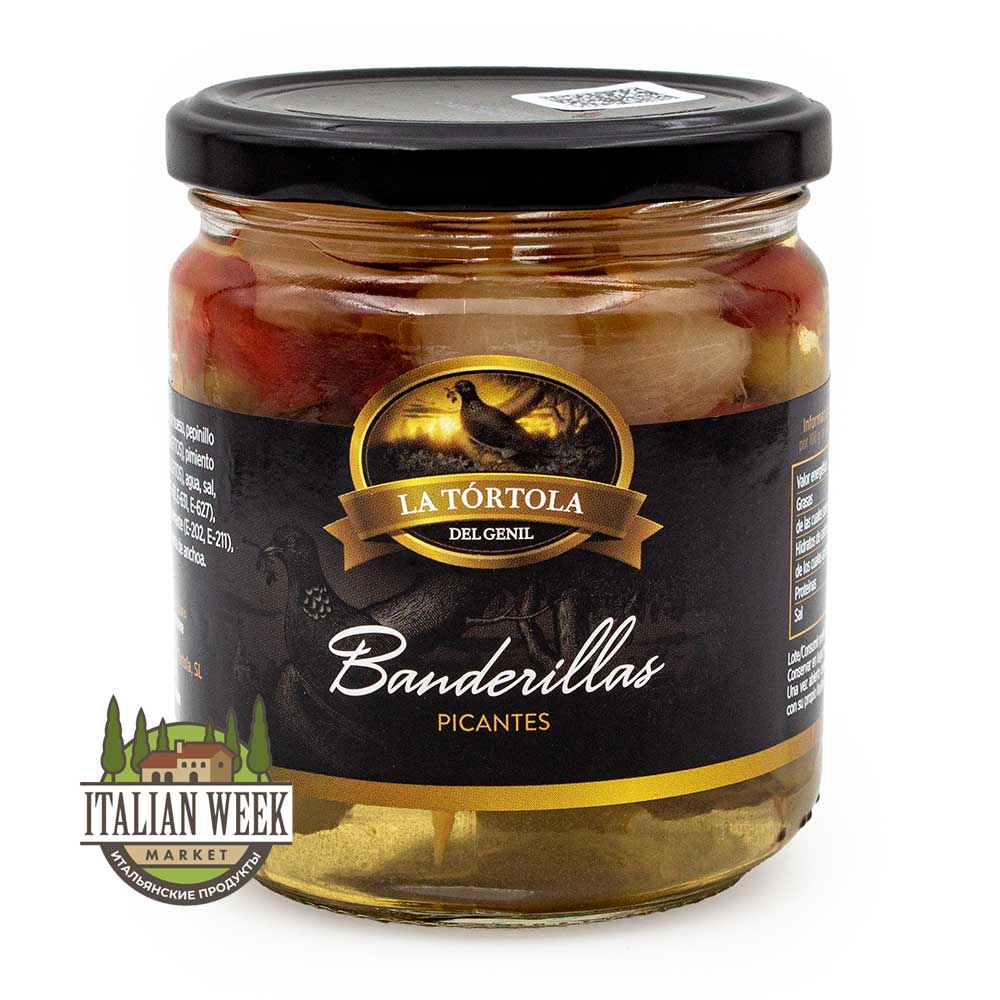 Огненный фейерверк вкусов в каждой банке! La Tortola представляет знаменитую испанскую закуску - острые бандерильяс. Это идеально сбалансированный микс лучших маринованных овощей, собранных на одну шпажку: хрустящий огурчик (пикули), нежная луковица, сладкий красный перец, обжигающая острая гуиндия (чили) и пикантная оливка без косточки. Каждый укус - это взрывной коктейль из хруста, кислинки, сладости и остроты, приготовленный по традиционному рецепту.